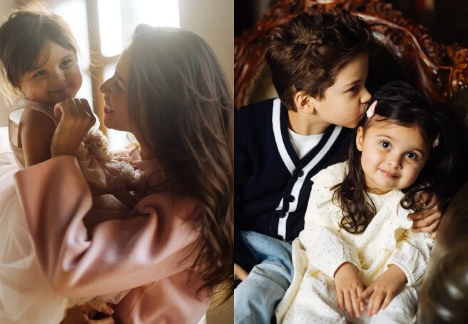 45-year-old Ravshana Kurkova shared photos from her New Year's family photoshoot on Instagram*. In the photo, the actress poses with her children: 5-year-old son Gaspar and 2-year-old daughter Samira.