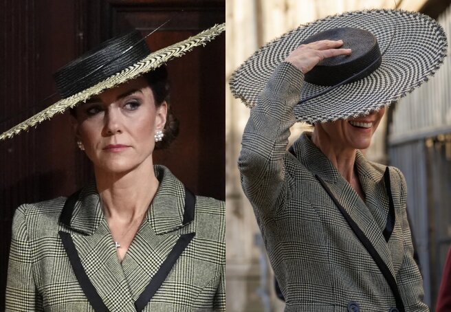 The princess's appearance at Canterbury Cathedral left no one indifferent: she wore a gray plaid coat dress by Suzannah London and high heels. Kate completed her outfit with pearl flower earrings and a classic Chanel handbag, but the highlight was a wide-brimmed hat from the English brand Juliette Millinery. The headdress, which many compared to the signature hats of US First Lady Melania Trump, almost completely hid Middleton's face and, due to the strong wind, kept trying to fly away - the princess had to hold it.