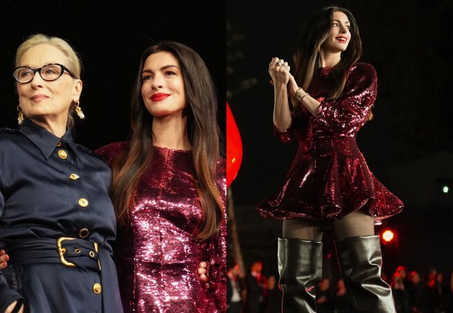 At the premiere, 43-year-old Anne Hathaway sparkled in a sequin minidress and leather thigh-high boots by Stella McCartney, while 76-year-old Meryl Streep wore a Schiaparelli look.
